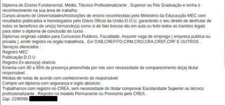 O anúncio diz ainda que os diplomas são válidos para concursos públicos, emitir registros como OAB (Ordem dos Advogados do Brasil, CRM (Conselho Regional de Medicina) entre outros. Ele ainda promete registro no MEC, publicação no DOU (Diário Oficial da União), ementa preenchida, médias de acordo com conhecimento do responsável e dá o número de WhatsApp para a negociação, com DDD do Rio de Janeiro.
