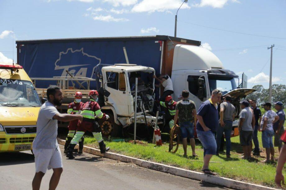 A cerca de 1,5 km a frete, uma colisão entre duas carretas, uma carregada com explosivos, deixou motorista preso nas ferragens. Embora a gravidade, o motorista estava consciente e orientado. As equipes da PRF (Polícia Rodoviária Federal) e CCR MSVia foram acionadas, além de Corpo de Bombeiros. O outro caminhão está carregado com explosivos e foi feito o isolamento do local.