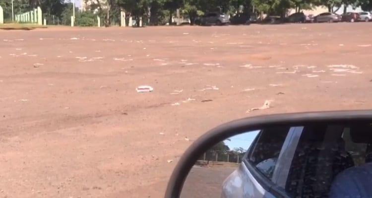 Após a cerimônia de entrega de ônibus escolares aos 79 municípios de Mato Grosso do Sul, na segunda-feira (8), lixo e pedaços de plásticos continuam no estacionamento do Parque das Nações Indígenas, e revoltou moradores da região, nesta quarta-feira (10).