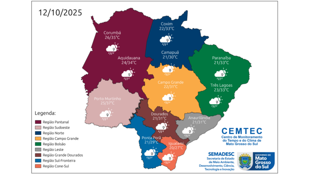 O domingo (12) de Dia das Crianças será chuvoso em todo o Estado. O Inmet (Instituto Nacional de Meteorologia) emitiu aviso laranja, de ‘perigo’, para tempestades em todas as cidades de Mato Grosso do Sul. As temperaturas variam de 20°C a 37°C, segundo o Cemtec (Centro de Monitoramento do Tempo e do Clima).