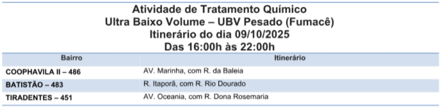 O fumacê visa conter a proliferação do mosquito Aedes aegypti, que também transmite zika e chikungunya. Conforme a CCEV (Coordenadoria de Controle de Endemias Vetoriais), das 16h às 22h, as equipes intensificam a desinfecção nos bairros: Coophavila II, Batistão e Tiradentes.