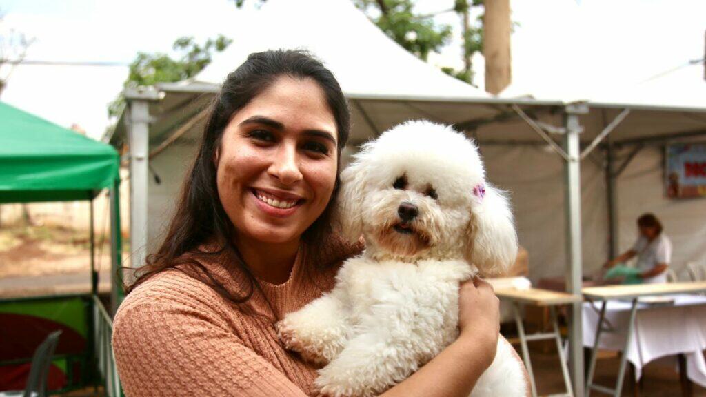 Vitória Gabriele Esteves levou a cadelinha Zara, que também foi resgatada após ter sido abandonada em um petshop para receber a benção neste Dia de São Francisco.