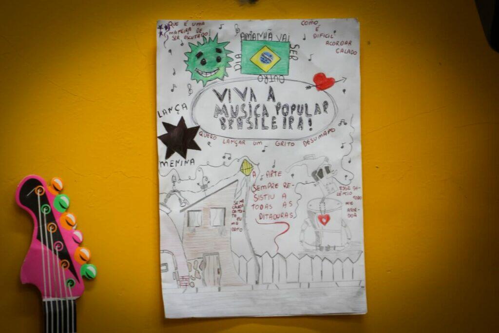 “Eu comecei na aula de música tocando ukulele e não sabia muito porque era pequeno. Depois, vi um violão, quis aprender a tocar e comprei um. E aí, chegou um amigo meu aqui na sala com uma guitarra, vi, achei ‘daora’ e quis uma também. Comprei uma guitarra e agora ‘tô’ aqui aprendendo na aula de música. E eu continuo na aula até hoje porque eu gosto de música, eu escuto vários tipos de músicas”, diz o roqueiro mirim.