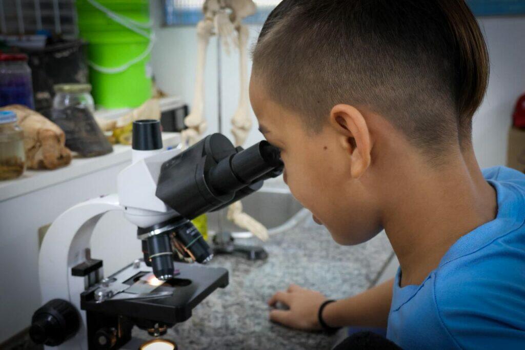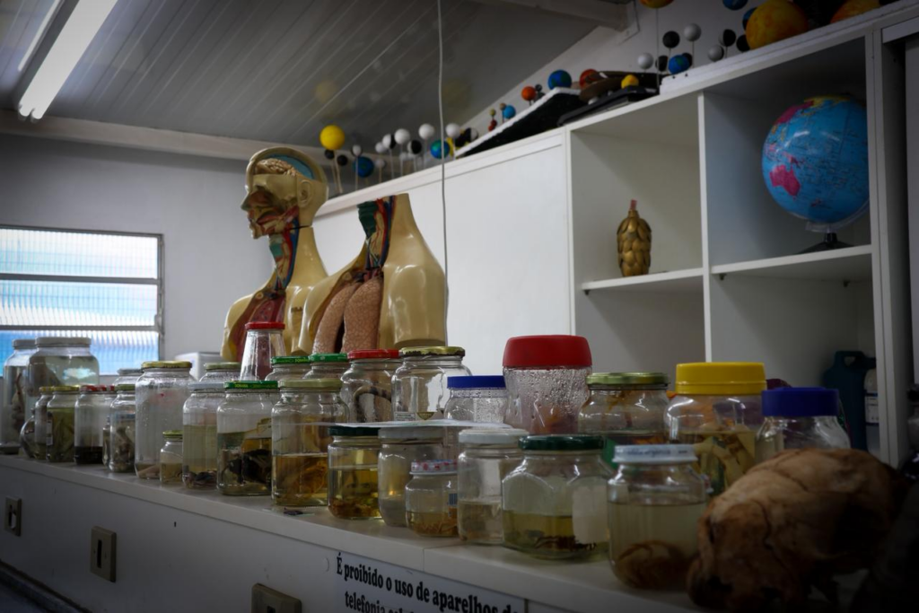 Paralelo aos trabalhos na horta está o laboratório de ciências, um dos lugares favoritos dos alunos. Além dos diversos exemplares de insetos, aracnídeos e serpentes disponíveis, o espaço também conta com microscópio trinocular e lupa eletrônica com conexão à TV.
