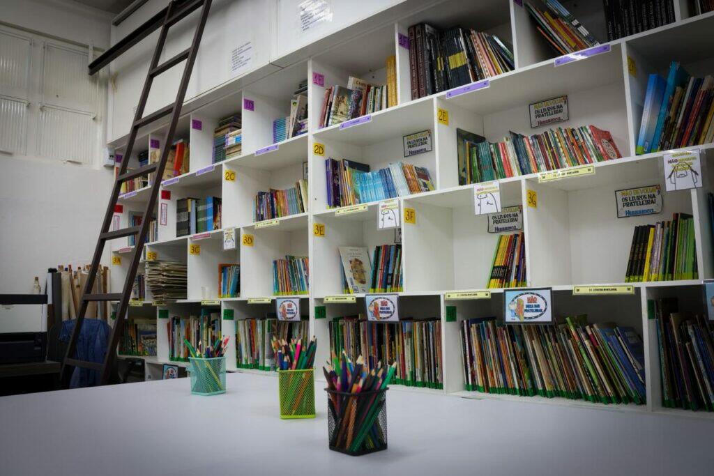 Do outro lado do corredor está a biblioteca da escola com um acervo múltiplo de livros e materiais artísticos dispostos em mesas e prateleiras. Buscando instigar ainda mais o hábito da leitura nos alunos, além das aulas feitas no espaço, a unidade passou a deixar o acesso livre à biblioteca durante os intervalos.
