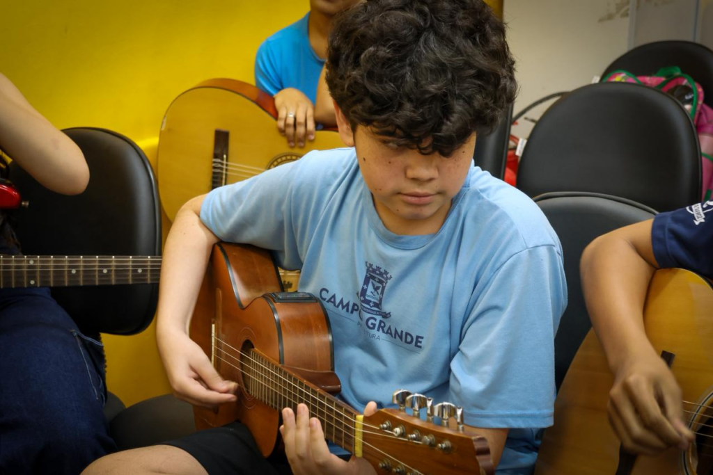 Na Escola Municipal Prof. Aldo de Queiroz, as aulas acontecem no contraturno, facilitando a participação dos alunos, e são coordenadas pelo professor Adisson Afonso. A sala é completa! Tem violão, cajon, teclado, guitarra e microfones para quem se arrisca no vocal. Cerca de 90 alunos participam das aulas, que ocorrem três vezes na semana.