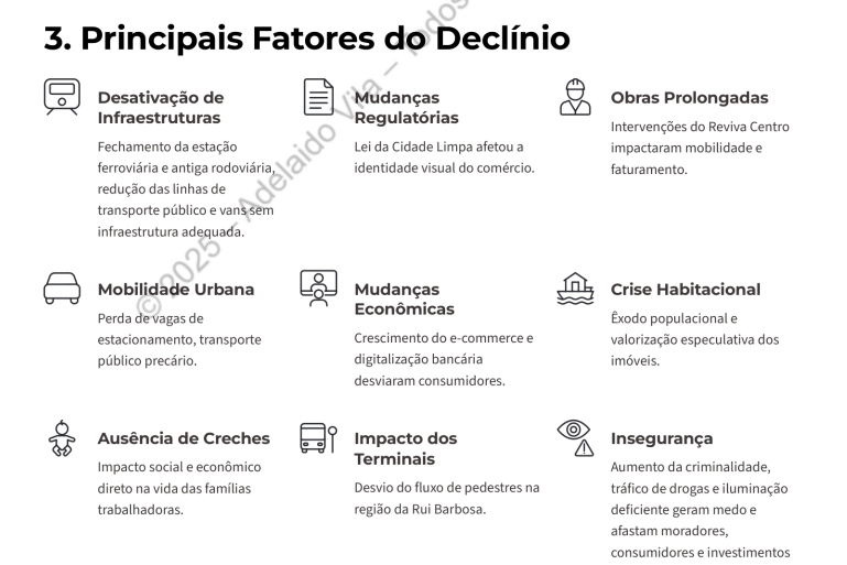 O relatório da CDL-CG mostra também que o tráfico de drogas e furtos se tornou um problema, além do “abandono urbano”, finalizando com um apelo ao poder público, sugerindo melhoria da infraestrutura urbana e parcerias público-privadas.