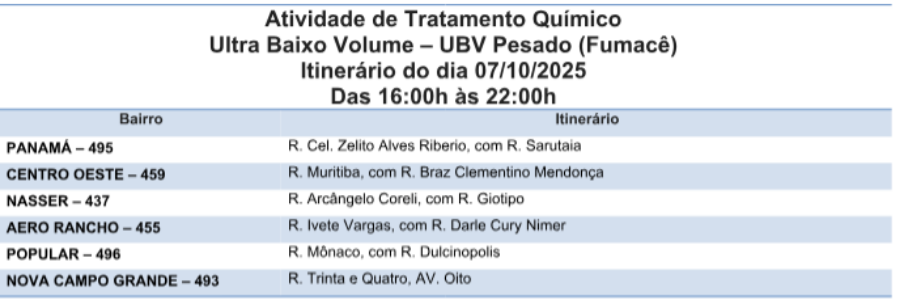 O fumacê visa conter a proliferação do mosquito Aedes aegypti, que também transmite zika e chikungunya. Conforme a CCEV (Coordenadoria de Controle de Endemias Vetoriais), das 16h às 22h, as equipes intensificam a desinfecção nos bairros: Jardim Panamá, Centro Oeste, Vila Nasser, Aero Rancho, Vila Popular e Nova Campo Grande.