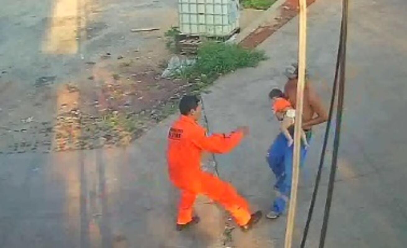 Imagens de câmera mostram um pai correndo com o filho no colo engasgado, à procura de socorro em quartel de Corumbá, e militares do Corpo de Bombeiros salvam o bebê, no final da tarde desta sexta feira (10).