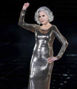 Jane Fonda brilha com vestido justo na passarela da Semana de Moda de Paris