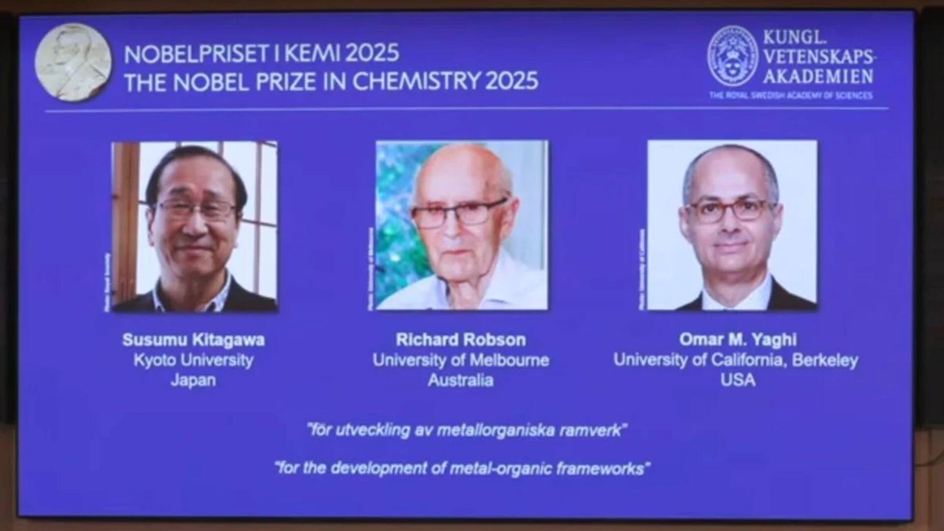 O Prêmio Nobel de Química 2025 foi concedido para os cientistas Susumu Kitagawa, Richard Robson e Omar M. Yaghi “pelo desenvolvimento de estruturas metalorgânicas (ou organometálicas)”, anunciou a Academia Real das Ciências da Suécia nesta quarta-feira, 8.