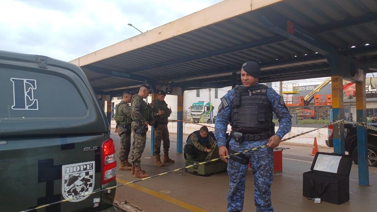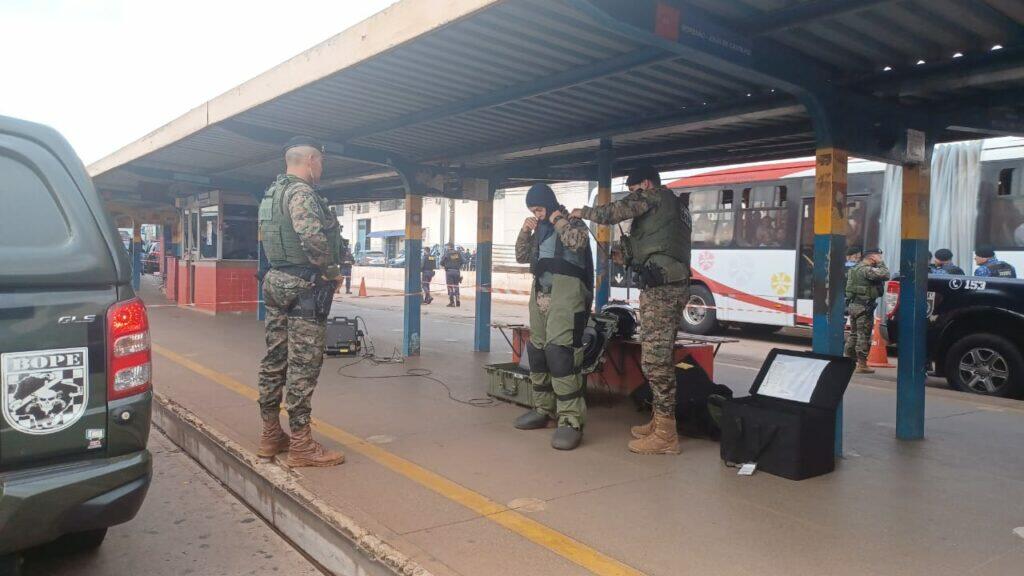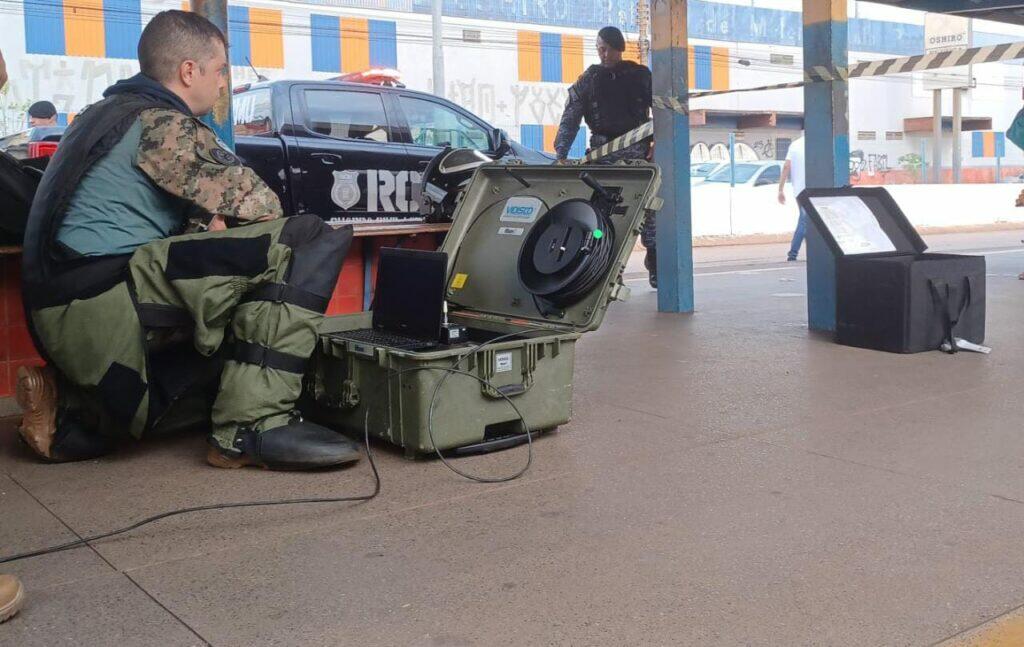 O esquadrão antibomba da Polícia Militar de Campo Grande está no local fazendo análise dos pacotes. O técnico analisa, via computador, se é possível desarmar a bomba ou se é necessário detonar o artefato, que parece ser caseiro.