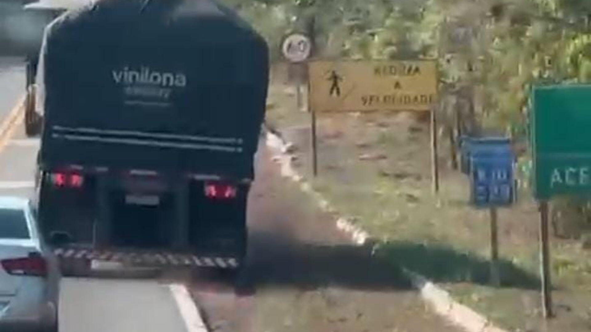 O acidente foi registrado por outro motorista que seguia logo atrás do caminhão e de um carro de passeio na rodovia. As imagens mostram o caminhoneiro trafegando em zigue-zague e invadindo a pista contrária em uma curva.