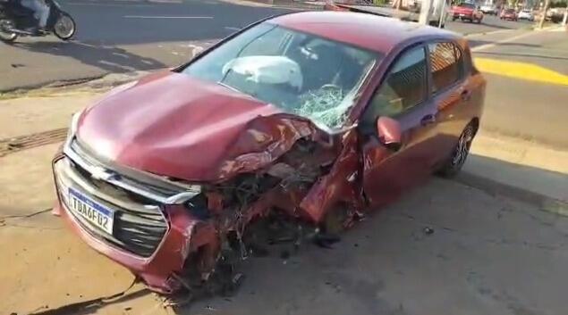Um carro Chevrolet Ônix ficou destruído, após o motorista do veículo colidir contra um poste, no Trevo Imbirussu, região oeste de Campo Grande. O acidente ocorreu por volta de 5h30 deste sábado (11).