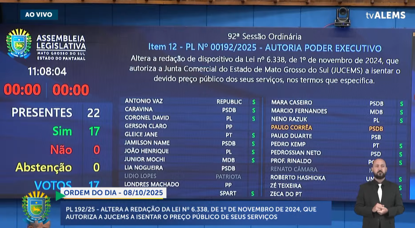 Foi aprovado pela Assembleia Legislativa de Mato Grosso do Sul o projeto de lei encaminhado pelo governador Eduardo Riedel que buscava isentar os municípios do estado do pagamento de taxas por serviços prestados pela Jucems (Junta Comercial).
