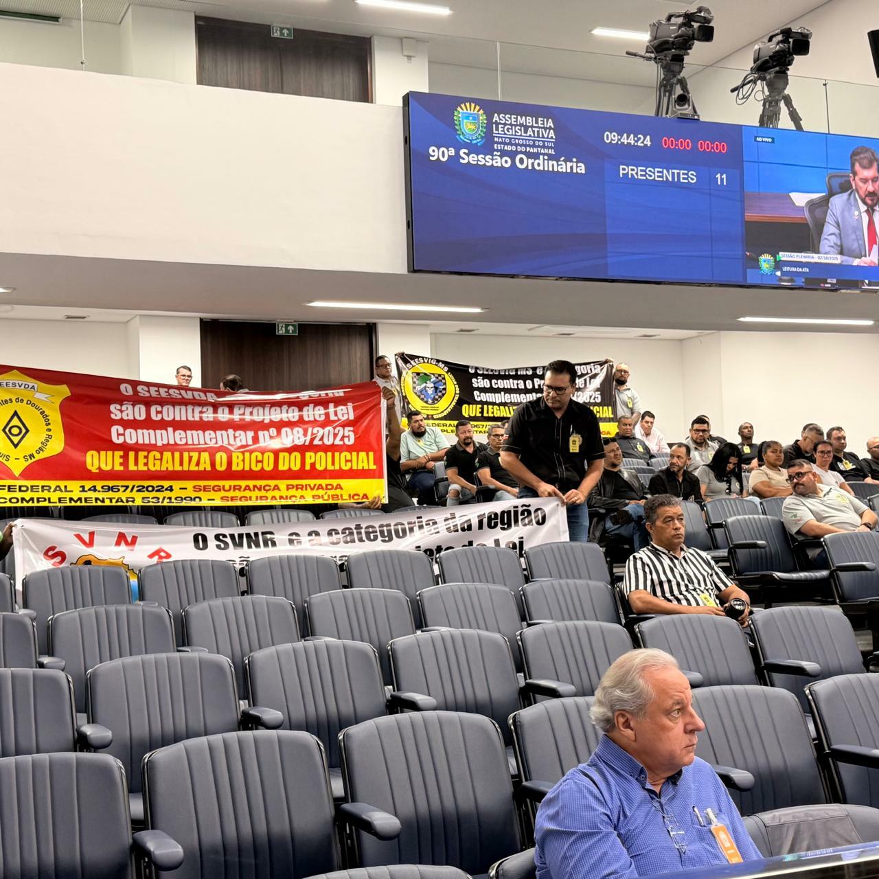 Representantes dos sindicatos de vigilantes de Campo Grande, Dourados e Naviraí realizaram um protesto na Assembleia Legislativa de Mato Grosso do Sul (Alems) nesta quinta-feira (2) contra um projeto de lei complementar que visa regulamentar o “bico” para policiais militares e bombeiros em suas folgas.