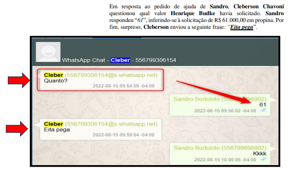 E, no dia seguinte, volta a cobrar o pagamento. “Nota-se que as cobranças de HENRIQUE não se dão de forma direta, mas suas mensagens, iniciando uma conversa sem contexto prévio, sem justificativa, sem conclusão de assunto, deixam claro ao empresário SANDRO que o Prefeito espera o acerto ilícito”.