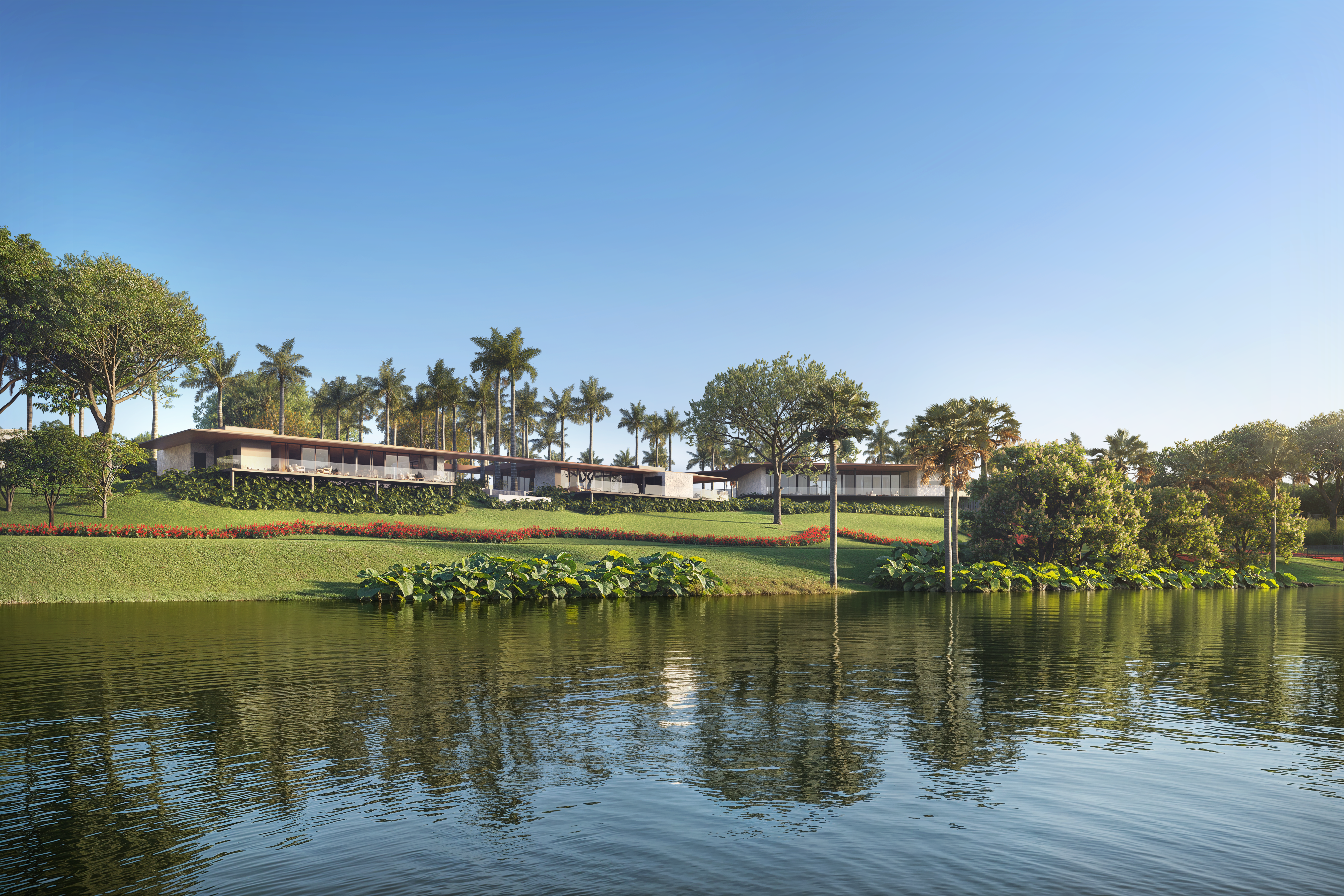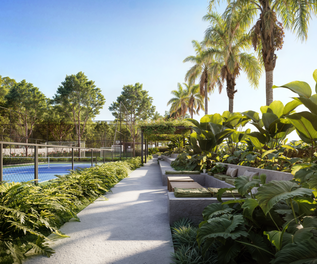 Mas se as referências vêm de fora, a essência está aqui. O Soul, em Campo Grande, é exemplo disso: seu paisagismo foi concebido como uma continuação da mata nativa existente, celebrando o cerrado e o pantanal com espécies brasileiras cuidadosamente selecionadas. Entre elas, estão Palmeira Jerivá, Guariroba, Butiá e Buriti, este último, um dos símbolos do cerrado brasileiro. A paleta de árvores inclui Jacarandás, Ipês, Cedros e Guapuruvus, enquanto forrações tropicais como filodendros, helicônias e primaveras criam um efeito de oásis no coração urbano da capital sul-mato-grossense.