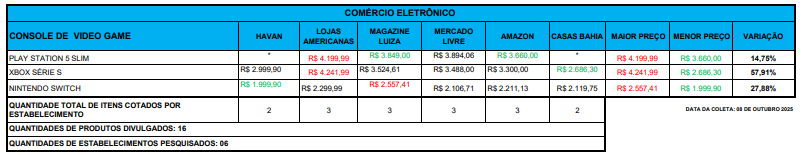 A pesquisa foi realizada em 8 de outubro e considerou os seguintes produtos: PlayStation 5 Slim, Xbox Série S e o Nintendo Switch, no site de seis empresas. São elas: Havan, Lojas Americanas, Magazine Luiza, Mercado Livre, Amazon e Casas Bahia.