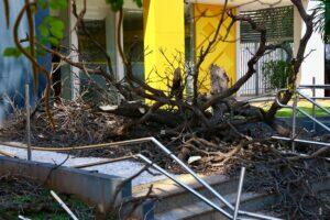 Árvore ‘dorme e acorda’ na porta de banco após queda em Campo Grande: ‘Estão entrando pelo gramado’